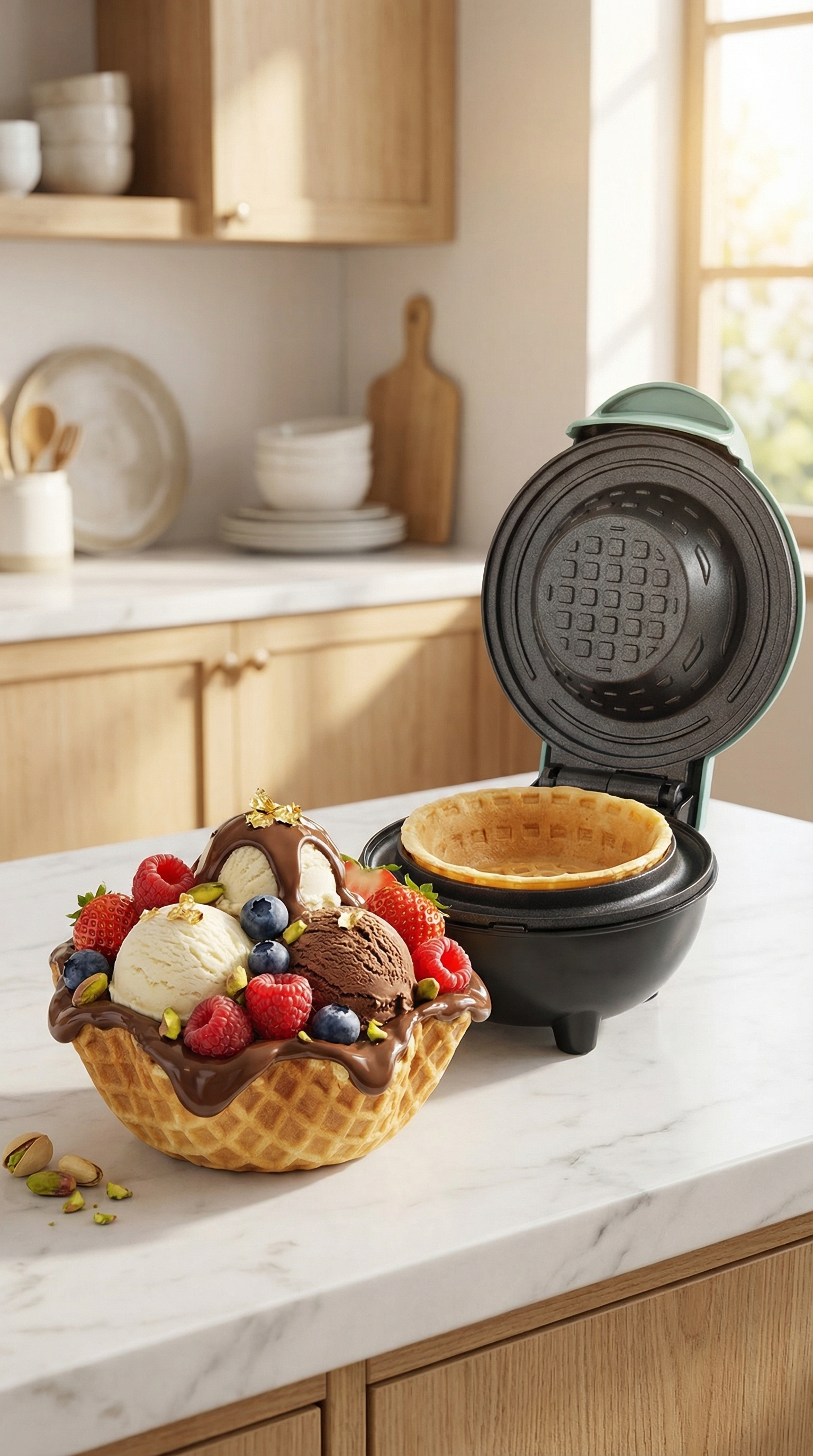 SweetBowl™ makes crisp waffle bowls, cones, and dessert shells at home.